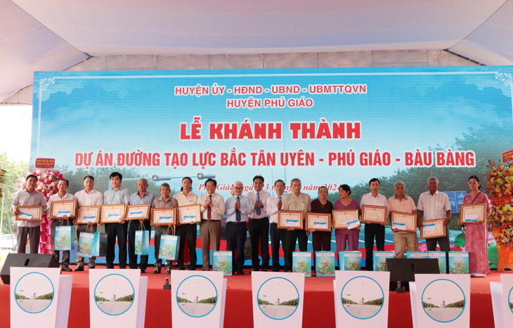 Lãnh đạo tỉnh tặng hoa cho lãnh đại diện lãnh đạo 3 huyện Bắc Tân Uyên – Phú Giáo – Bàu Bàng và đơn vị thi công